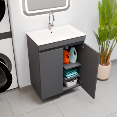 Szafka łazienkowa stojąca / wisząca RIBERA 60 Grafit z umywalką i koszem na pranie – nowoczesność i funkcjonalność