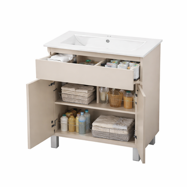 Model został wykonany z wysokogatunkowej płyty laminowanej 18 mm w kolorze kaszmir, co podkreśla elegancję oraz naturalny wygląd. Szafka wyposażona jest w pojemną szufladę z modułowym wkładem, dwuskrzydłowe drzwi z regulowaną półką oraz system cichego domykania. Dopełnieniem zestawu jest ceramiczna umywalka sanitarna ze standardowym otworem na baterię i syfon – trwała, gładka i łatwa do utrzymania w czystości.