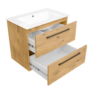 Seria Girona to meble stworzone specjalnie dla zwolenników industrialnego stylu. Ta szafka łazienkowa z umywalką wyróżnia się loftowym charakterem, podkreślonym przez naturalną barwę dębu lancelot i kontrastującą białą ceramikę. Elegancja idzie tu w parze z funkcjonalnością – szeroka umywalka ceramiczna oraz dwie pojemne szuflady z pełnym wysuwem zapewniają komfort i wygodę na co dzień.