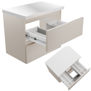 Szafka łazienkowa CALPE 60 cm w kolorze kaszmir mat z blatem biały połysk, wisząca z modułową szufladą.