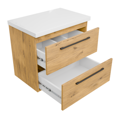 Seria Girona to propozycja dla osób ceniących nowoczesny design w połączeniu z praktycznymi rozwiązaniami. Ta szafka łazienkowa z blatem wyróżnia się loftowym charakterem, podkreślonym przez ciepły kolor dębu lancelot, biały połysk blatu i eleganckie czarne uchwyty.