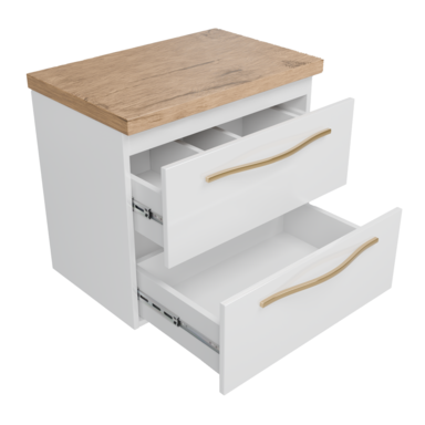 GIRONA 60 – szafka łazienkowa wisząca biały połysk z dębowym blatem i złotymi uchwytami