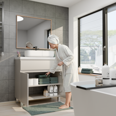 Szafka łazienkowa Ariza 80 w kolorze kaszmir z białym, lakierowanym blatem to eleganckie połączenie nowoczesnego designu i praktycznych rozwiązań. Matowe fronty i korpus w odcieniu kaszmiru nadają wnętrzu wyrafinowany charakter, a kontrastujący, błyszczący blat w bieli podkreśla minimalistyczny styl i optycznie rozjaśnia przestrzeń. Opcja montażu stojącego na regulowanych nóżkach lub wiszącego zapewnia pełną elastyczność aranżacyjną. Wprowadź do swojej łazienki elegancki, nowoczesny styl dzięki szafce łazienkowej ARIZA 80 w kolorze kaszmir. Ciepły, matowy odcień kaszmiru optycznie ociepla wnętrze i idealnie komponuje się z nowoczesną armaturą.